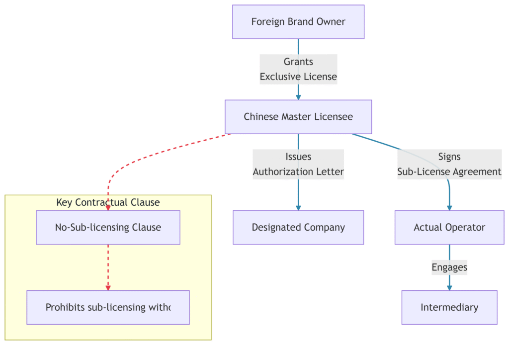 Brand Owners often include a No-Sub-licensing Clause in master agreements to maintain quality control, approving sub-licenses on a case-by-case basis. The Brand A Case highlights that the greatest legal risks arise in the second tier—the relationship between the master licensee and the operator.